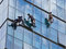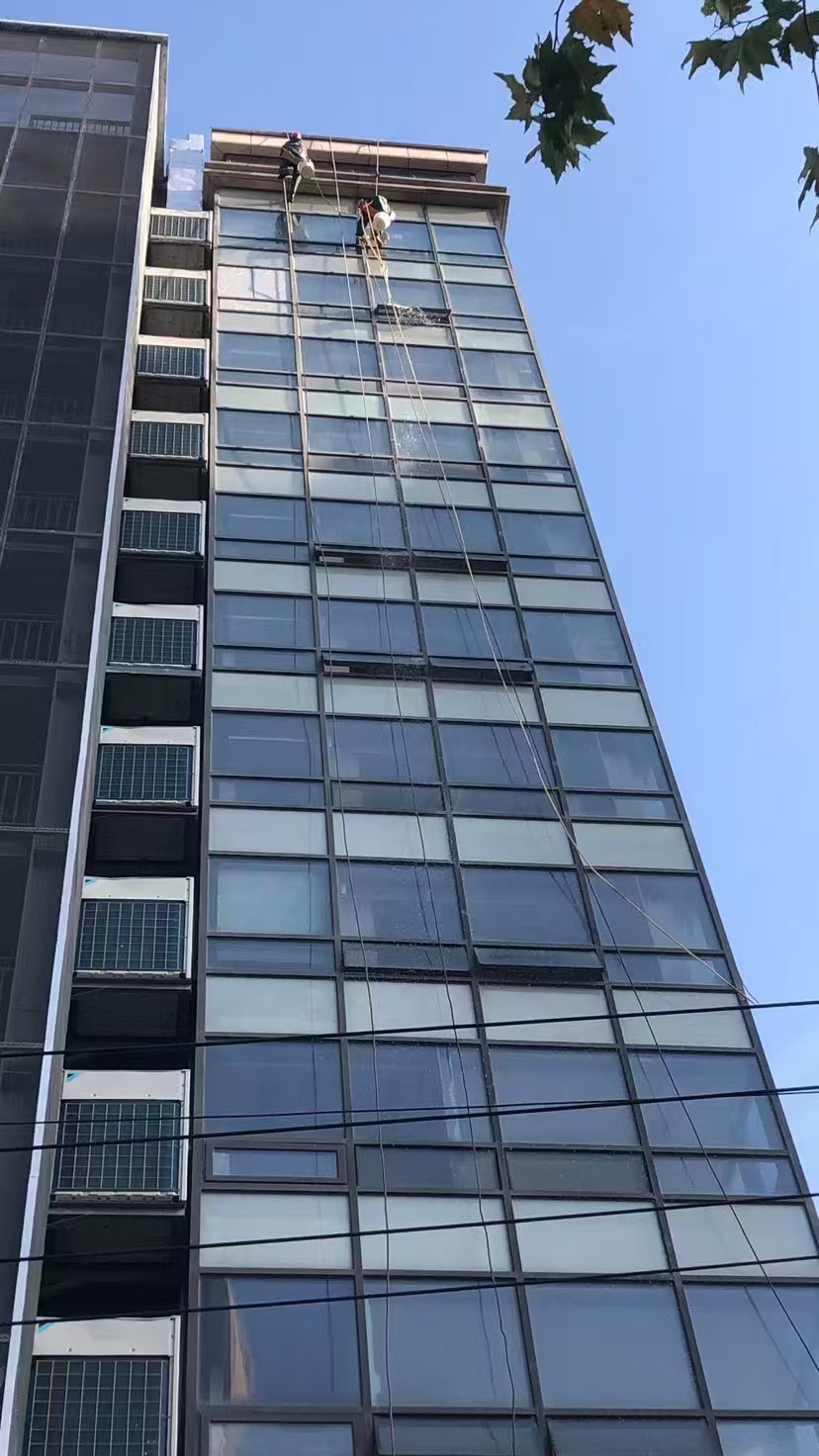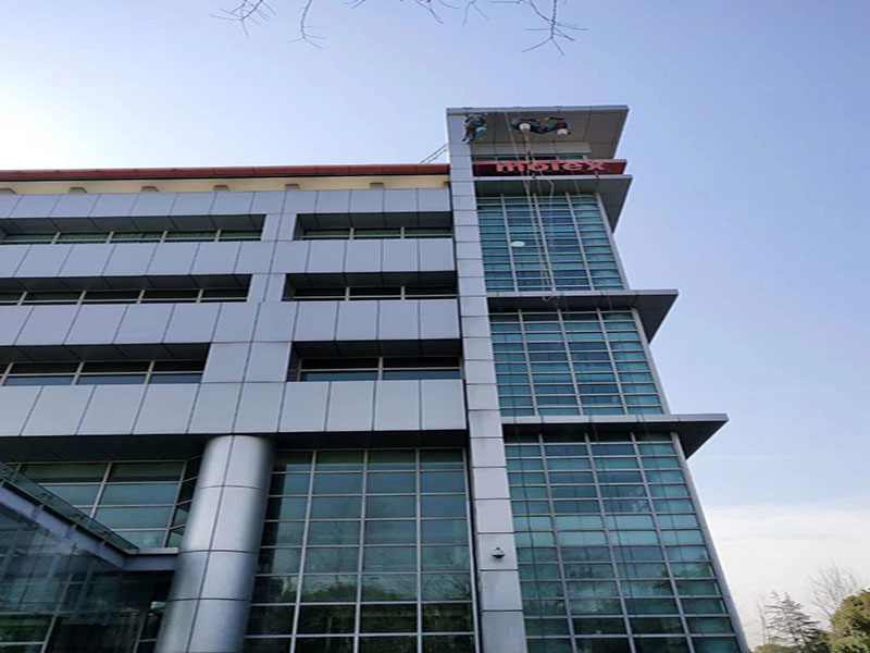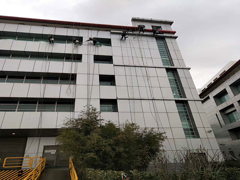 2、吊籃方式:在樓頂架設吊籃將工人運送到指定位置進行施工操作。此施工方式清洗效率較低,成本較高。